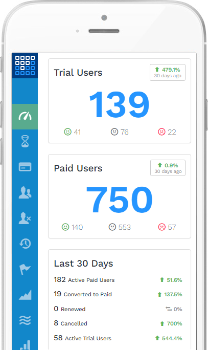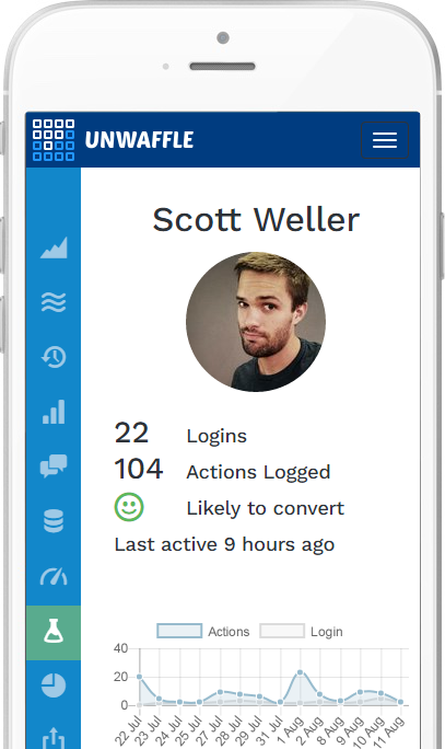 Watch your users as they progress through their Trial period. Unwaffle will compile a profile with a Happiness Index that can tell you with a surprising degree of certainty whether they will convert to a paid subscription once their Trial is up.